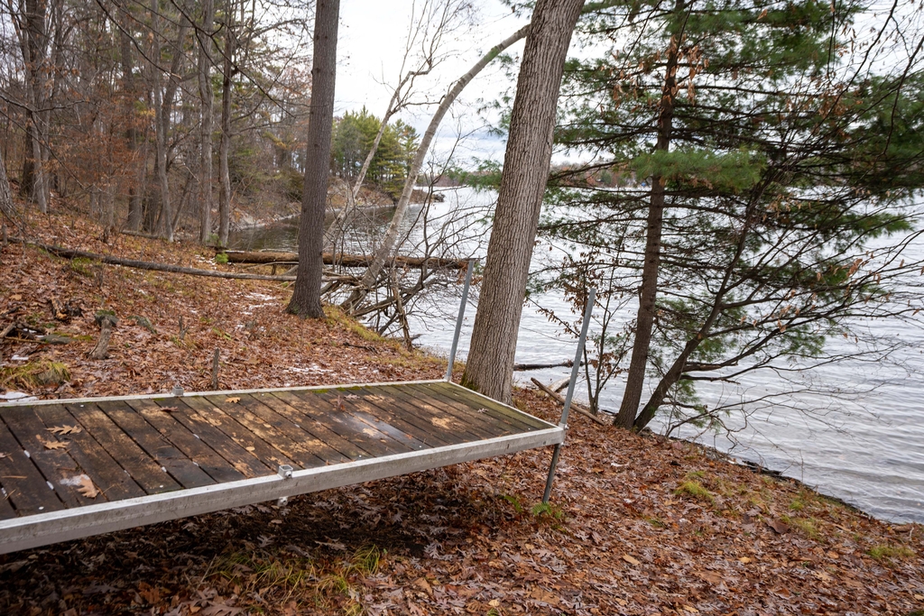 The shoreline is natural and there is a dock in place as well as stairs that lead to a shed/bunkie. The lot is nicely treed and has easy access off the road.