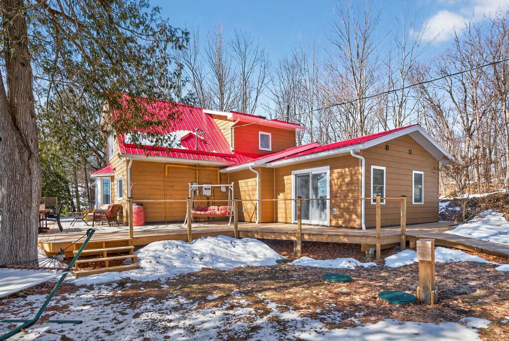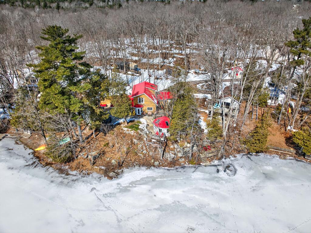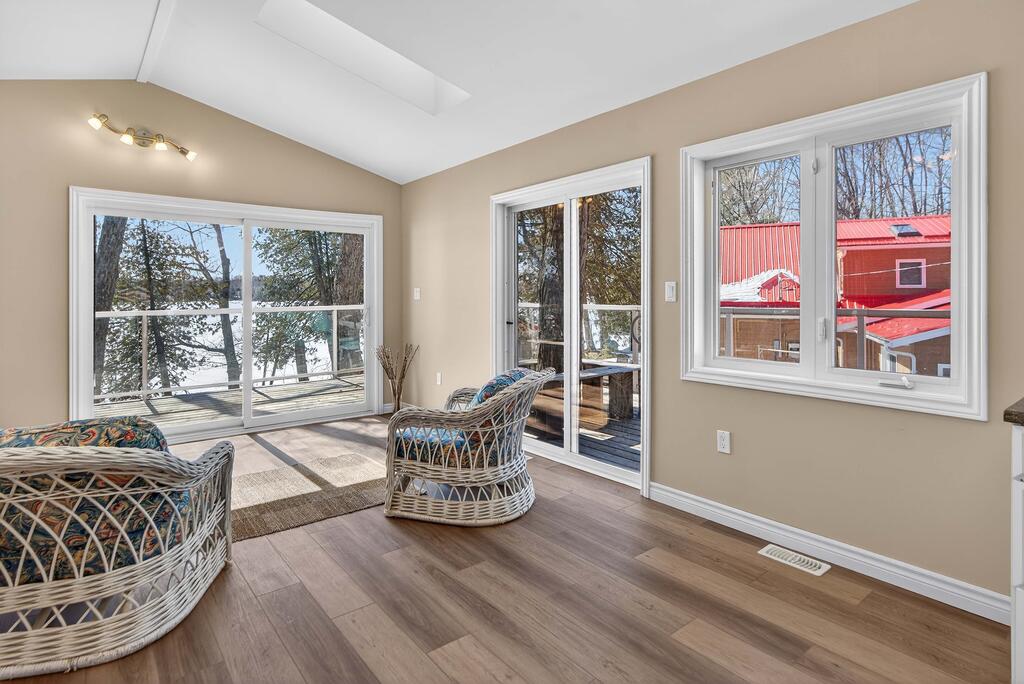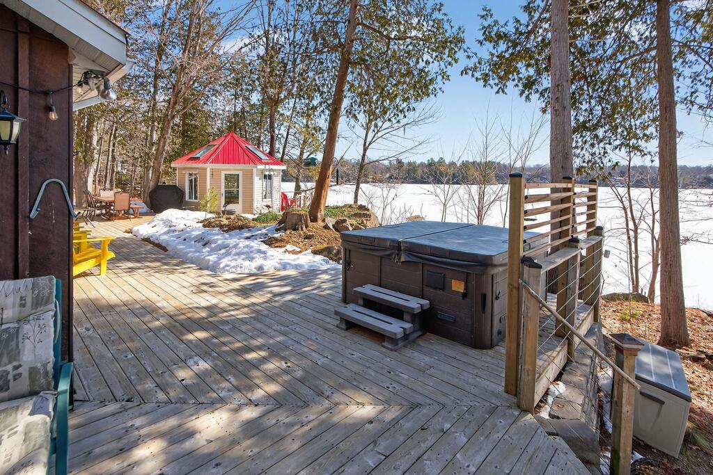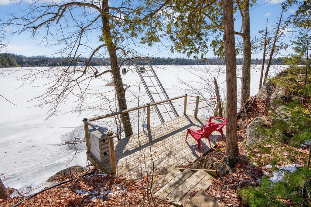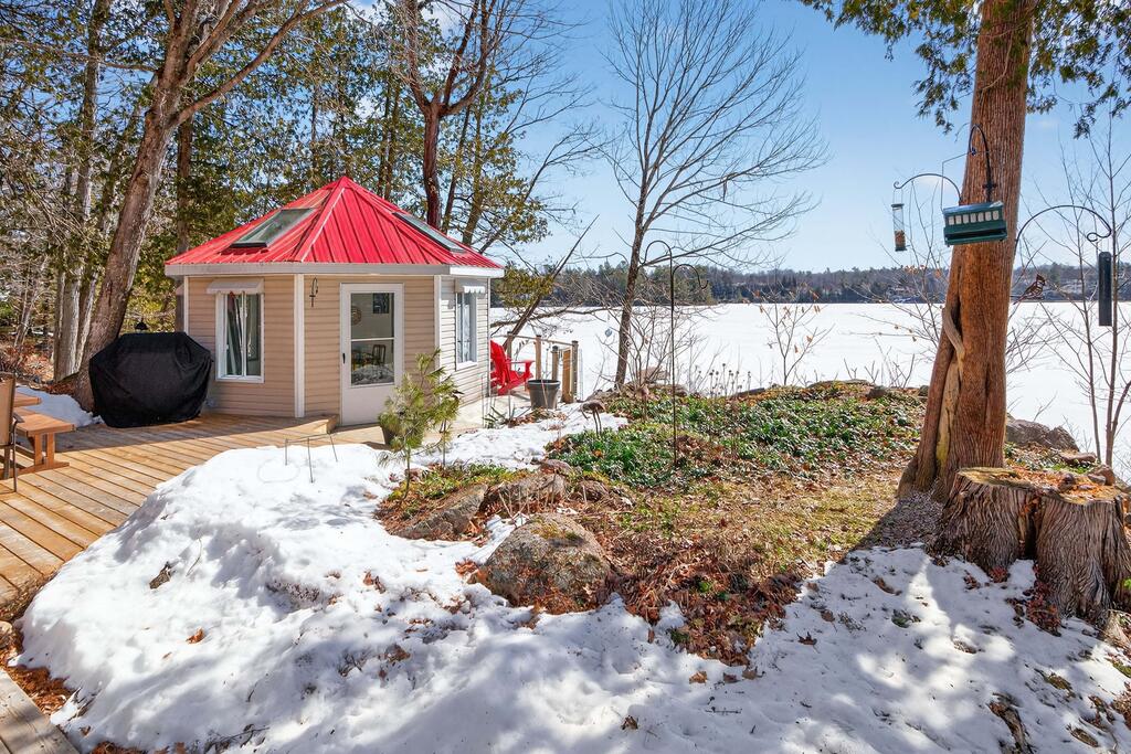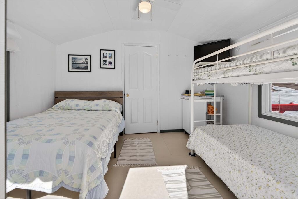 For additional space and flexibility, the property includes a fully separate guest cottage. This charming retreat offers a bedroom, a sitting area, a full bathroom, and an upper level with cabinetry, a kitchen sink, and access to a large deck overlooking the lake. This cottage is heated with a forced air propane furnace plus a wood stove and is serviced by the drilled well and septic system – all set for year-round use.