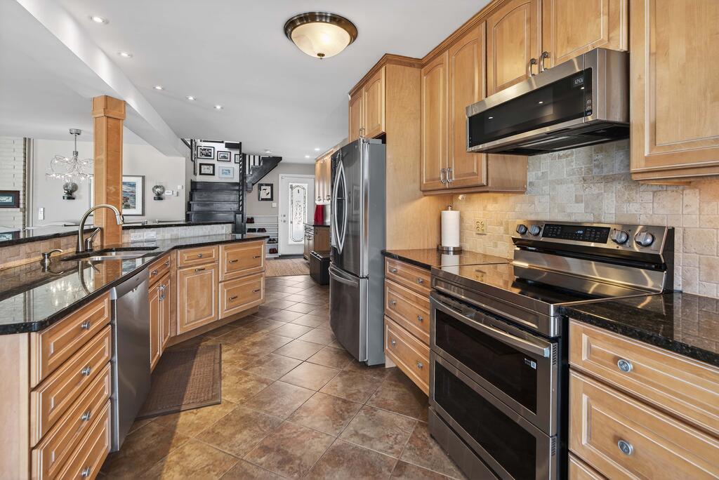 - Stone countertops in kitchen